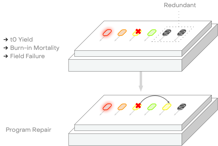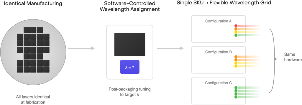 On-PIC wavelength tunability allows every laser on the wafer to be identical at fabrication. Targets are “software-controlled” post-packaging, enabling a single-SKU HVM strategy where one module design supports multiple frequency grids, dramatically improving yield.