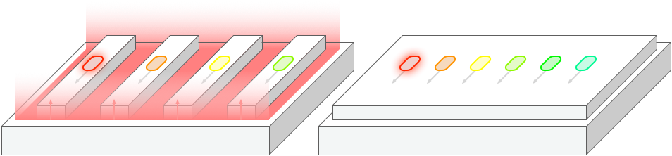 Energy-efficient heating within the multi-wavelength cavity. Independent tuning of colors without thermal coupling or spectral drift.